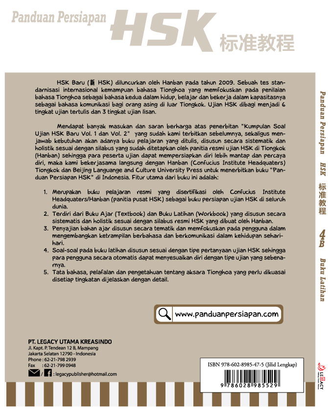 Mendapat banyak masukan dan saran berharga atas penerbitan “Kumpulan Soal Ujian HSK Baru Vol. 1 dan Vol. 2” yang sudah kami terbitkan sebelumnya, sekaligus menjawab kebutuhan akan adanya buku pelajaran yang ditulis, disusun secara sistematik dan holistik sesuai dengan silabus yang sudah ditetapkan oleh panitia resmi ujian HSK di Tiongkok (Hanban) sehingga para peserta ujian dapat mempersiapkan diri lebih mantap dan percaya diri, maka kami bekerjasama langsung dengan Hanban (Confucius Institute Headquaters) Tiongkok dan Beijing Languange and Culture University Press untuk menerbitkan buku “Panduan Persiapan HSK” di Indonesia. Fitur utama dari buku ini adalah: